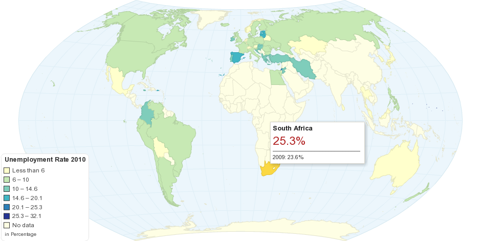 This map shows 2010 global unemployment rate in percentage.