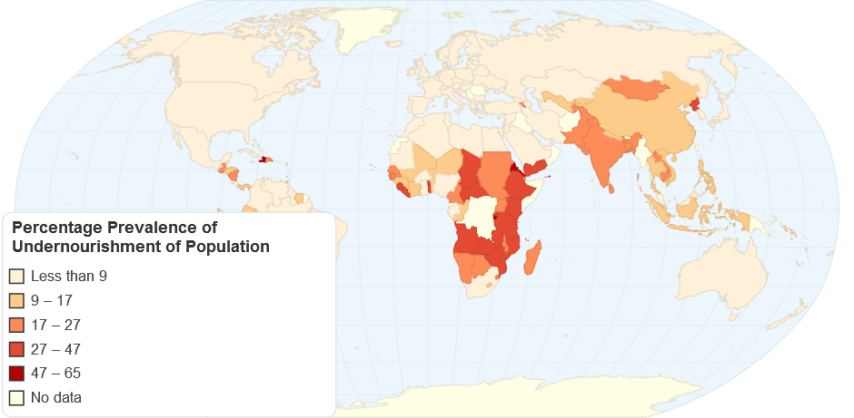 Using data from The World Bank, this map displays the variation of undernourshment prevelence by country in percentage of each country's population.