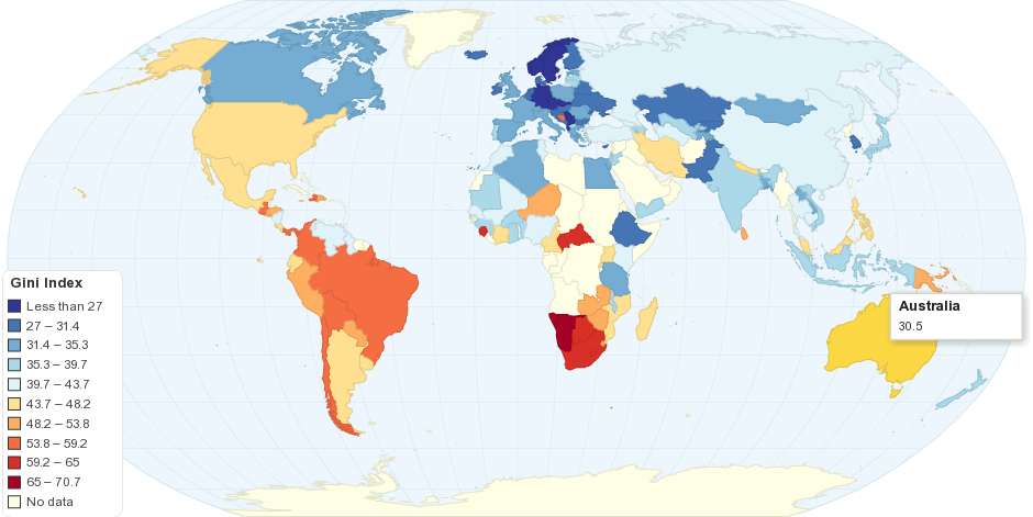 This map shows the degree of inequality in the distribution of family income (Gini index or Gini coefficient) in each country. Income distribution measure the gap between the rich and the poor. In a very uneven income distribution, the rich are VERY RICH and the poor are VERY POOR, comparatively