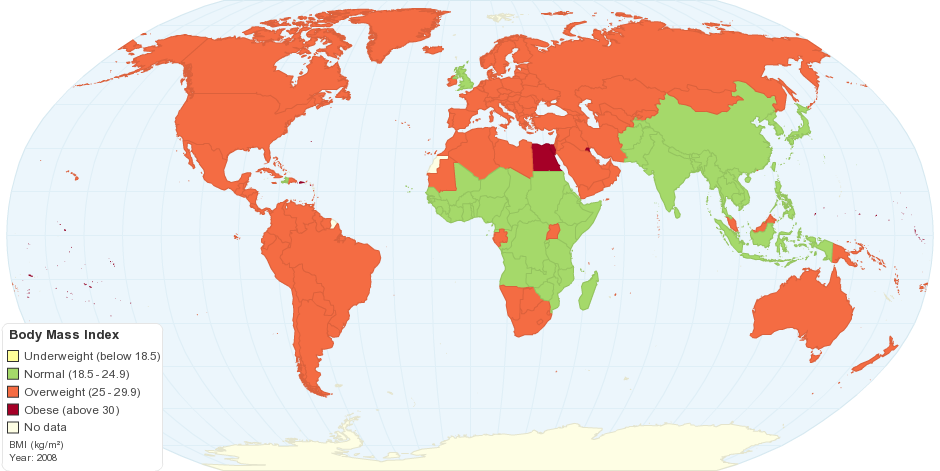 This map shows World trends in age-standardized mean Body Mass Index (BMI) 199 countries over 28 years.