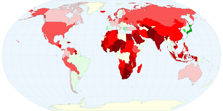 In this map, countries coloured in red reflect less than 50% of people who answered that they both knew something about global warming and did not think the warming world was due to the activities of people. Those countries where people were more convinced that the rsing temperature was due to anthropgenic causes are coloured in progressively darker green.