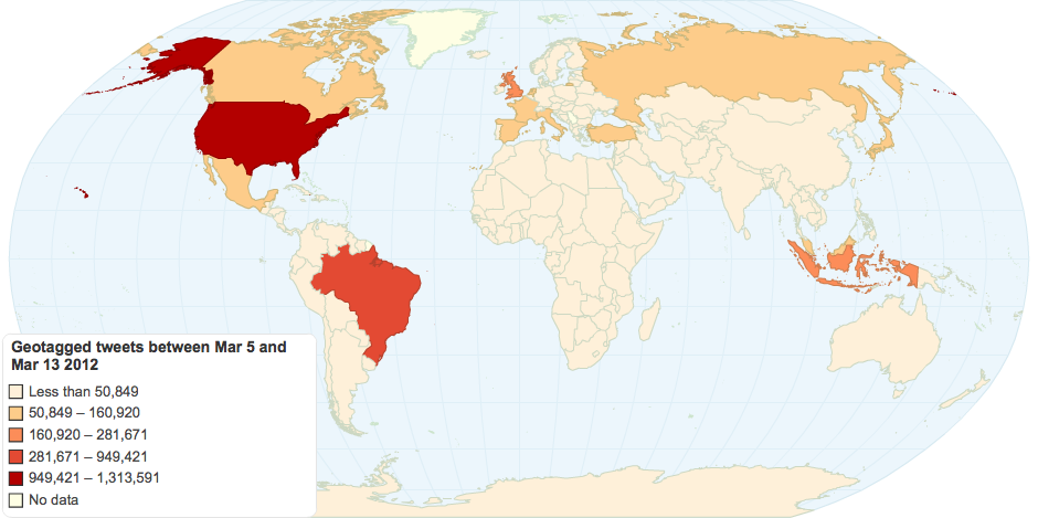 The map visualises the number of geocoded tweets per country between March 5 and March 13 2012. More information available from Dr. Mark Graham (www.geospace.co.uk)