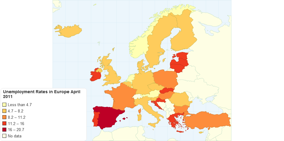 This is a map showing the unemployment rates in the countries of Europe, for the month of April 2011. Official statistics from Eurostat.