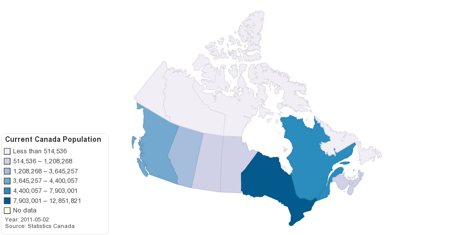 This map shows current Canada population by provinces and territories.