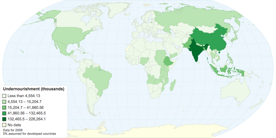 Undernourished population, in thousands, 2008. a 5% undernourishment rate was assumed for developed countries. Data from World Bank Development Indicators (http://data.worldbank.org/indicator)
