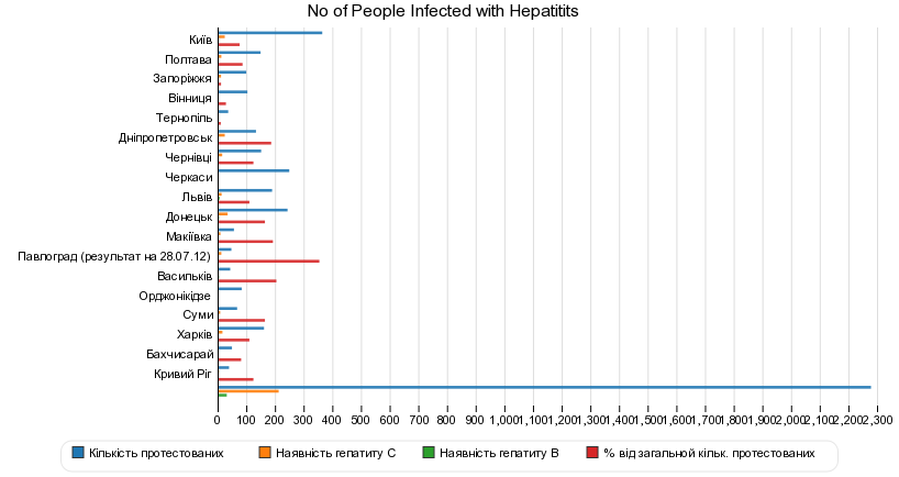 This chart shows the results of express-tests on hepatitis infection conducted in 19 towns of Ukraine on July 28