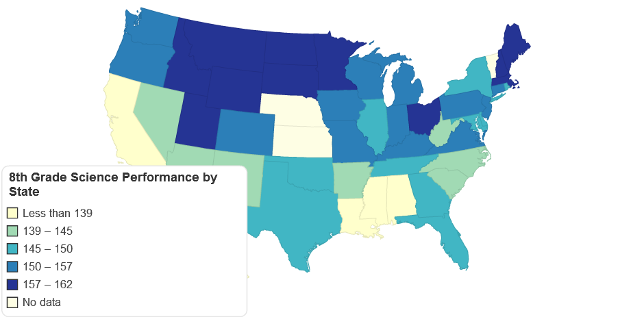 NOTES: National average for United States is reported value in National Assessment of Educational Progress (NAEP) reports. NAEP grade 8 science scores for public schools only.