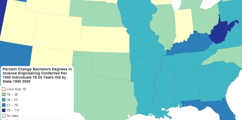 Change Bachelors Degrees in Science Engineering Conferred Per 1000 Individuals 18 24 Years Old by State 1990 2009, ChartsBin.com, viewed 14th February, 2026, <http://chartsbin.com/view/7306>.