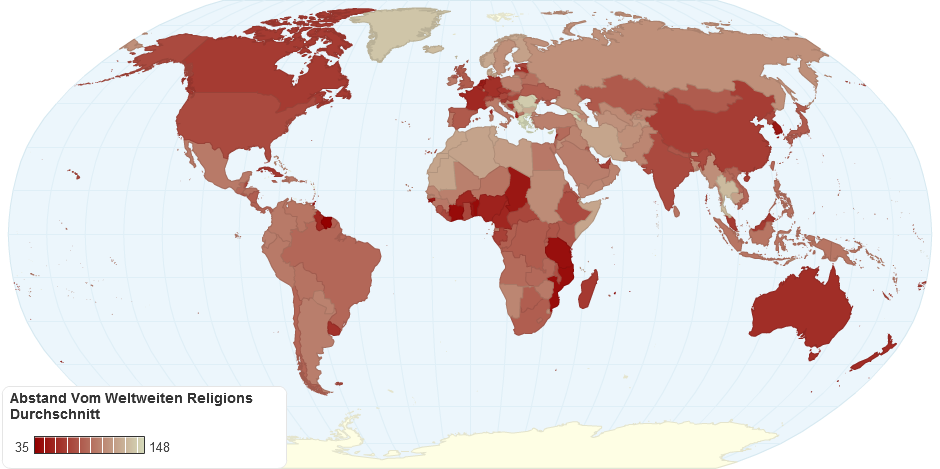 je tiefer das rot, desto näher ist die Zusammensetzung der Religionen im jeweiligen Land dem weltweiten Durchschnitt. (Methode: Geometrische Distanz der Prozentzahlen)