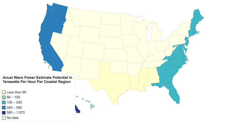 The Mapping and Assessment of the U.S. Ocean Wave Energy Resource, published last year, calculated the total available wave energy resources along the outer continental shelf (200 m depth contour). The results are shown on this map. Alaska has the most wave energy potential by itself with over 1,500 TWh/yr, followed by the whole West Coast which in total has the potential to produce 590 TWh/yr between the states of Washington, Oregon and California.