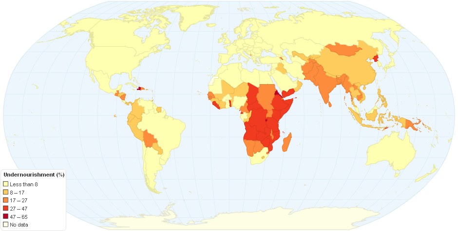 Undernourishment around the world in 2008, expressed in percentage. Source: World Bank Development Indicators (sourced 2012)