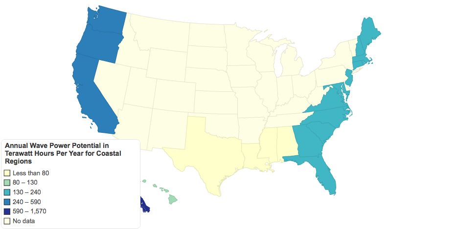 The total available wave energy resources along the outer continental shelf (200 m depth contour), according to the Mapping and Assessment of the U.S. Ocean Wave Energy Resource, add up to around 2,500 TWhr/yr (1 terawatt = 1 trillion watts). Alaska has the most wave energy potential with over 1,500 TWhr/yr. The West Coast, with a total regional potential of 590 TWhr/yr for Washington, Oregon and California, comes in second. The U.S. uses about 4,000 terawatt hours (TWh) of electricity per year.Scientists are aware that waves will always be best on the West Coast because they are created by winds that blow from west to east. CREDIT: Lorena Villa Parkman. SOURCE OF DATA: Mapping and Assessment of the United States Ocean Wave Energy Resource. Electric Power Research Institute.