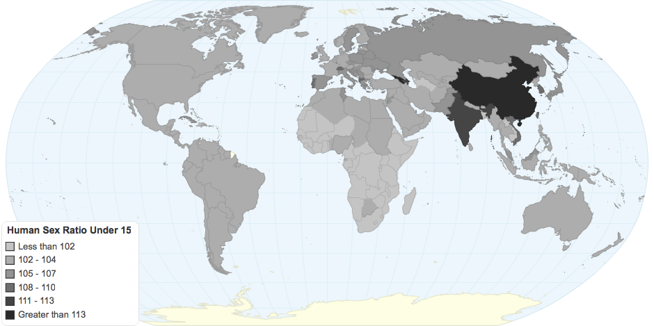 World Map of Countries by Sex Ratio under 15 using 2011 CIA data