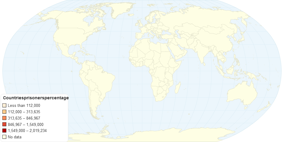 Populations in prisons per 100,000. Figures include convicts serving time, awaiting trial, or otherwise detained.