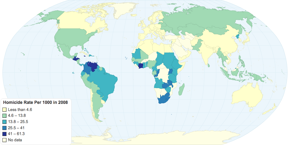 Homicide rate per 1000 in 2008 source Gapminder and UNODC