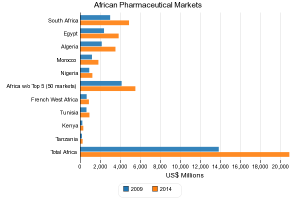 IMS Health estimates that the top 5 countries, South Africa, Egypt, Algeria, Morocco and Nigeria account for 70% of the value of pharmaceutical markets in Africa. The rest of the continent, without the Top 5 (50 markets) makes up 30% of the total value.