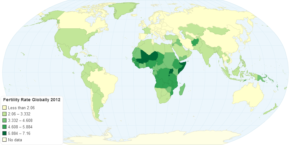 "This entry gives a figure for the average number of children that would be born per woman if all women lived to the end of their childbearing years and bore children according to a given fertility rate at each age. The total fertility rate (TFR) is a more direct measure of the level of fertility than the crude birth rate, since it refers to births per woman. This indicator shows the potential for population change in the country. A rate of two children per woman is considered the replacement rate for a population, resulting in relative stability in terms of total numbers. Rates above two children indicate populations growing in size and whose median age is declining. Higher rates may also indicate difficulties for families, in some situations, to feed and educate their children and for women to enter the labor force. Rates below two children indicate populations decreasing in size and growing older. Global fertility rates are in general decline and this trend is most pronounced in industrialized countries, especially Western Europe, where populations are projected to decline dramatically over the next 50 years." CIA WORLD FACTBOOK 2012