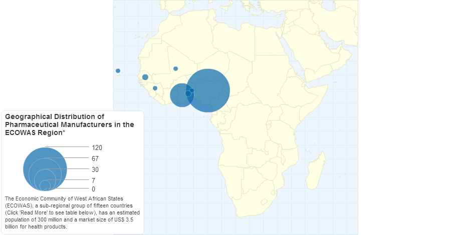 The West Africa sub-region makes up almost a third of the whole of Africa and has a strong presence of pharmaceutical manufacturers, with currently over 200 active manufacturers of pharmaceuticals. According to PMG-MAN, Nigeria is responsible for about 60 per cent of medicines produced in the Economic Community of West African States (ECOWAS), a sub-regional group of fifteen countries (See Table below), which has an estimated population of 300 million and a market size of US$ 3.5 billion for health products.