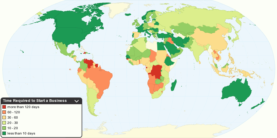 This map shows time required to start a business around the world in days. Time required to start a business is the number of calendar days needed to complete the procedures to legally operate a business.