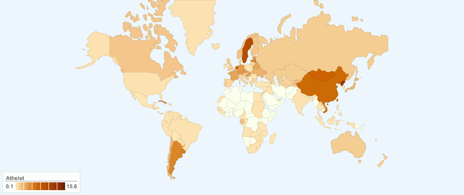 This chart represents only declared Atheists and not Agnostics. For Agnosticism Adherents by Country click http://chartsbin.com/view/omz.