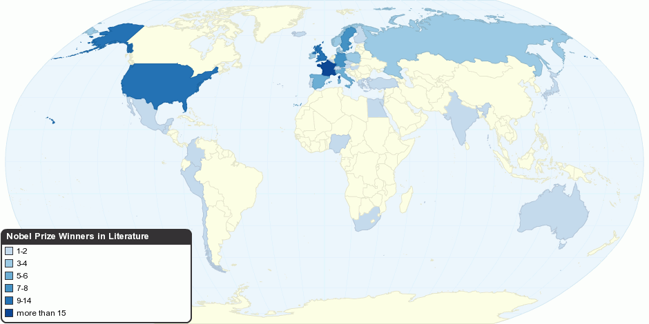 This chart shows current Nobel Prize Winners in Literature ranked by country. The Nobel Prize Winners in Literature has been awarded 107 Nobel Laureates between 1901 and 2010.