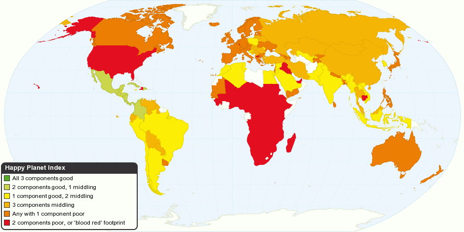 This map shows the overall scores from the second global compilation of the Happy Planet Index (HPI). The HPI is an index of human well-being and environmental impact.