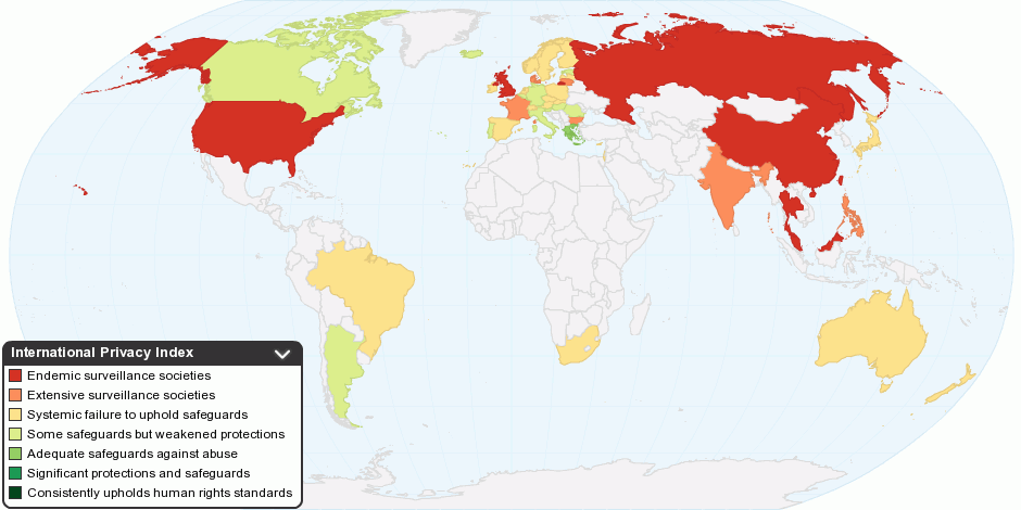Since 1997 the UK-based Privacy International in cooperation with the US-based Electronic Privacy Information Center has conducted annual surveys in order to assess how much privacy protection nations' populations have from both corporative and government surveillance.