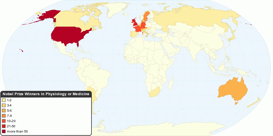 This chart shows current Nobel Prize Winners in Physiology or Medicine ranked by country. The Nobel Prize Winners in Physiology or Medicine has been awarded 196 Nobel Laureates between 1901 and 2010.
