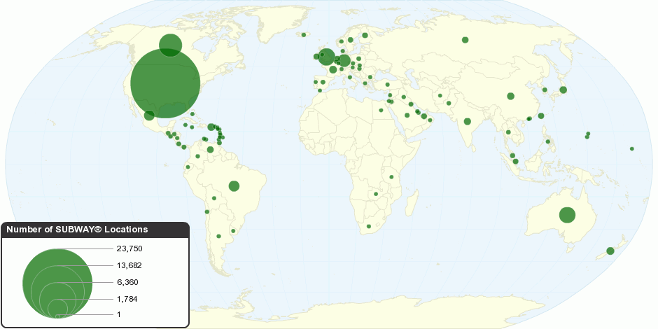 This map shows number of SUBWAY restaurant locations in each country.