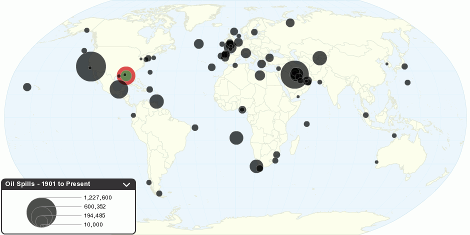 | Deepwater Horizon (Gov’t Low Est) | Gulf of Mexico | 162,337 | 04/21/2010 | Crude oil | Wellhead blowout | An underwater well gushed oil into the Gulf unrestrained until June 6, when a containment cap began capturing some. On July 15, a better-fitting containment cap was attached. Relief wells are being drilled to stop the flow permanently. |