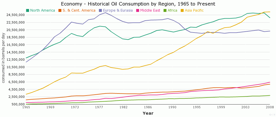 This chart shows the historical Oil Consumption in barrels per day - 1965 onwards.