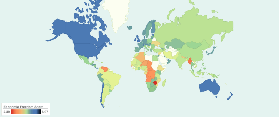 This chart shows the Economic Freedom of the World seeks to measure the consistency of the institutions and economic policies of various countries around the world. The ratings are based on a 0 to 10 scale, with 10 being most free and 0 the least.