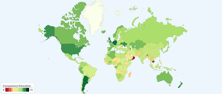 This chart shows duration of compulsory education around the world. Compulsory education means number of years that children are legally obliged to attend school.