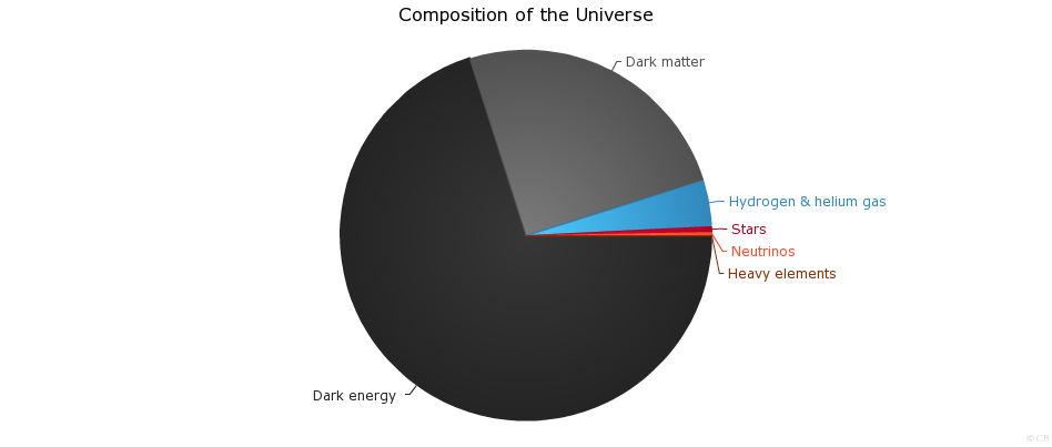 According to the latest observational evidence, ordinary matter, including stars, planets, dust and gas, only make up a tiny fraction of the universe (5%). The rest is the elusive dark matter (~25%) and dark energy(~70%).