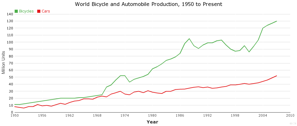 This chart shows World Bicycle and Automobile Production, 1950 to 2007.